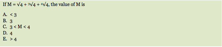 Now, ³√4 has to lie between the square root of 4 and the fourth root of 4 or between 2 and 1.414, so value of M has to be greater than 4.